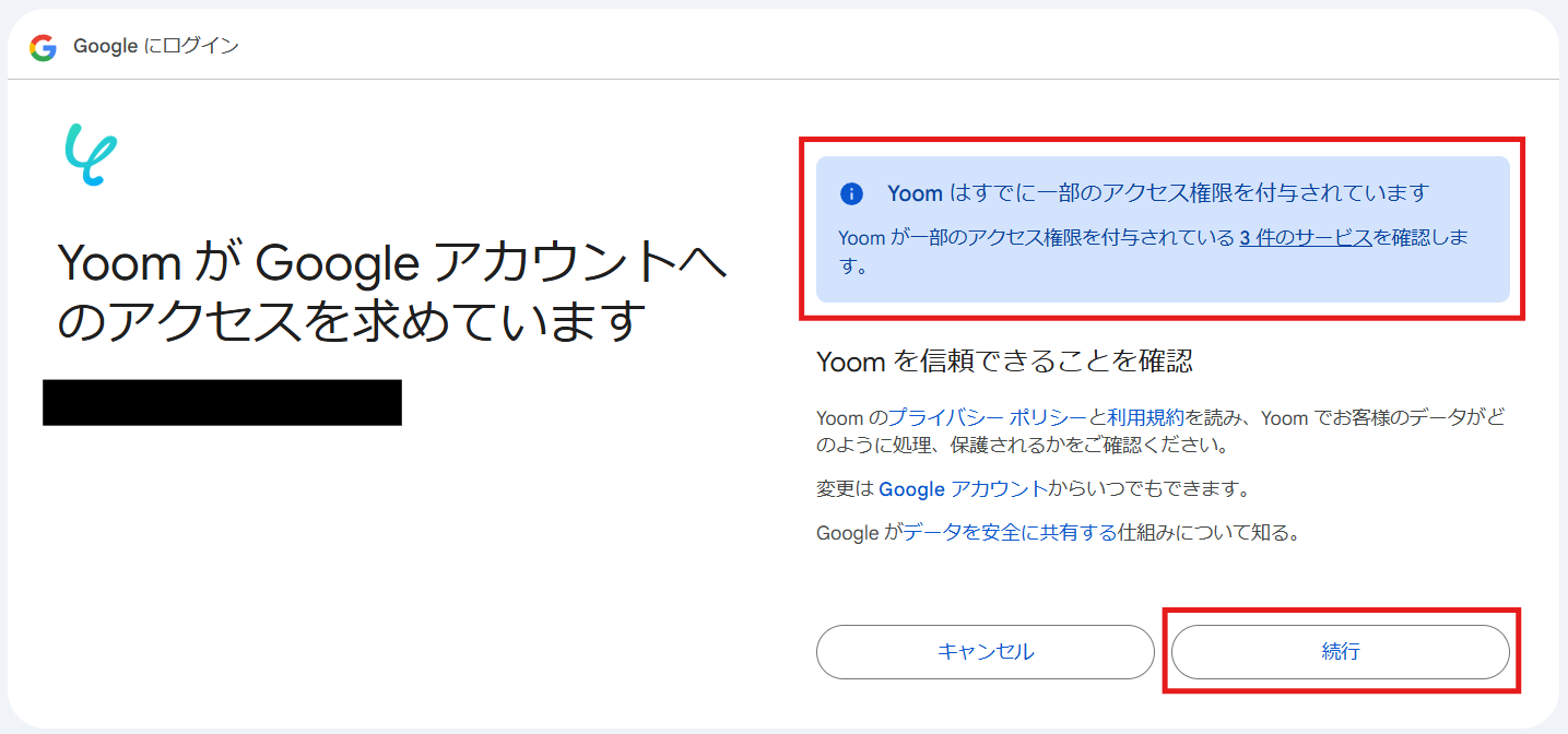 (4)Yoomがアクセスできる情報をすべて選択し、「続行」をクリックします。 ※すでに別のGoogleアプリを連携している方は、あらかじめアクセス権限が付与されています。