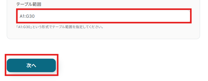 (5)「テーブル範囲」に更新したいデータが記載されているテーブルの範囲を任意で設定します。設定が完了したら「次へ」をクリックします。
