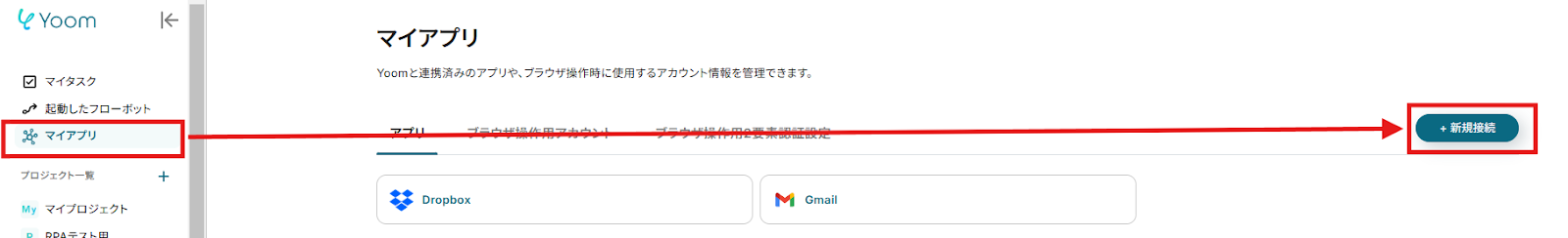 まずは、GmailとGoogle スプレッドシートをマイアプリ連携します。 Yoomにログインしたら、左のメニュー欄にある「マイアプリ」から「新規接続」をクリックしましょう。