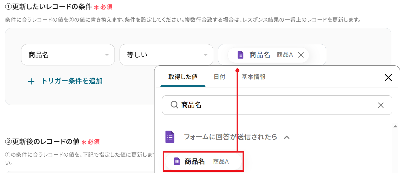 まず「①更新したいレコードの条件」の「商品名」「等しい」の右の欄に、ステップ3で取得したアウトプットの「商品名」を選択します。