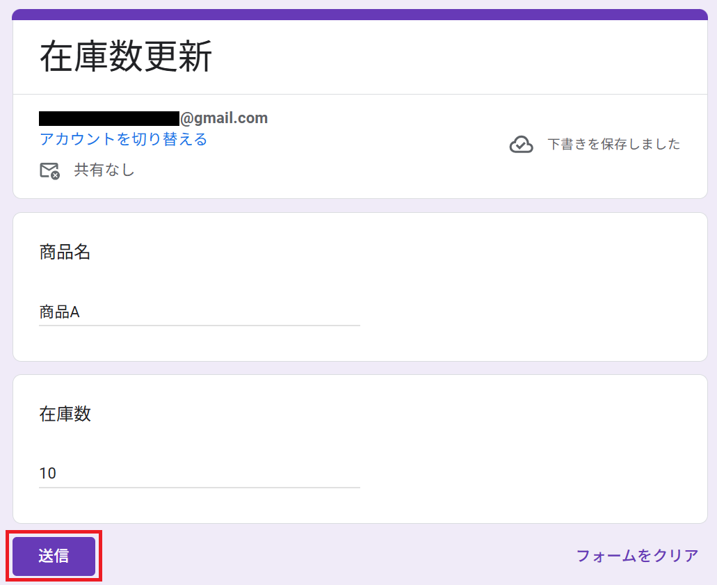成功したら保存しましょう。フォームの内容に合わせて、シートの在庫数が15 → 10に更新されました!