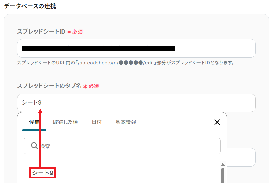 次に、先ほど用意したシートの「スプレッドシートID」と「スプレッドシートのタブ名」を候補から選択します。