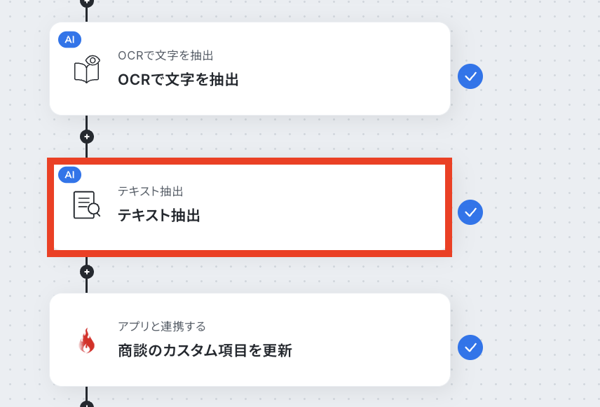 - 次に、オペレーションでAI機能の「テキスト抽出」を設定し、ファイル名やOCRで抽出した情報から必要な項目を抜き出します