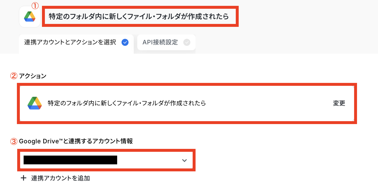 ②アクション:デフォルトで「特定のフォルダ内に新しくファイル・フォルダが作成されたら」が選択されているのでそのままで問題ありません!