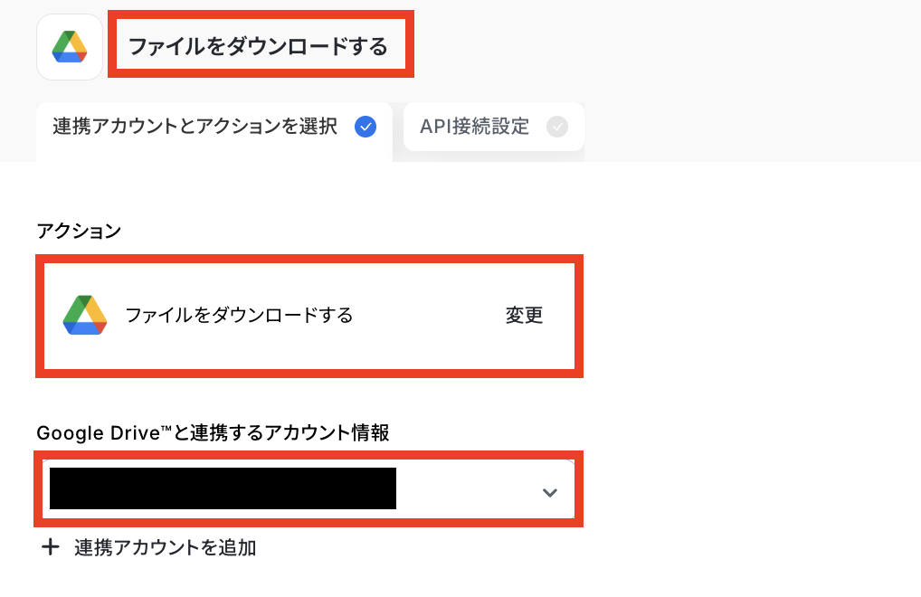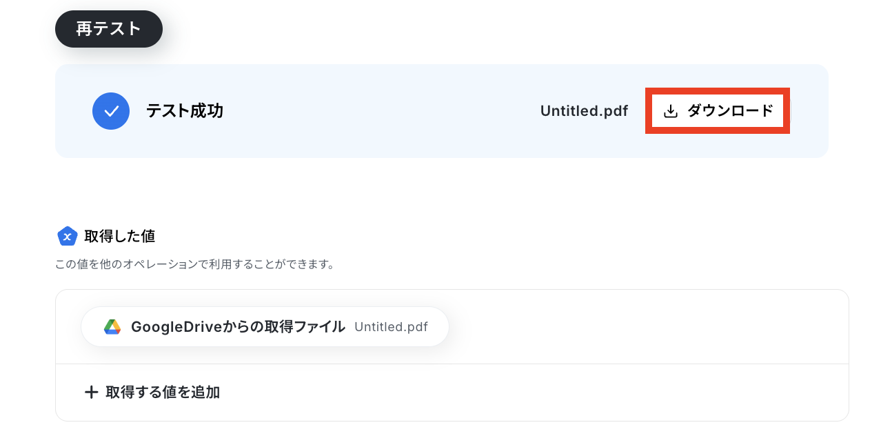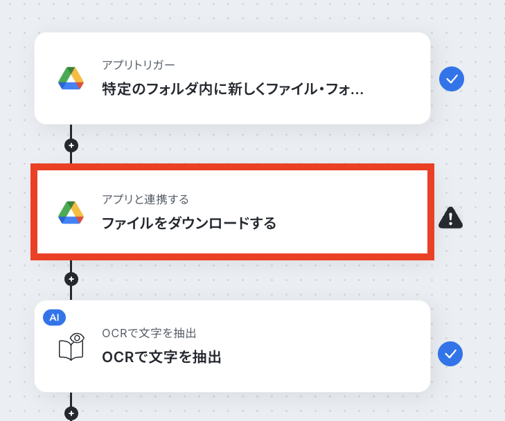 - 続いて、オペレーションでGoogle Driveの「ファイルをダウンロードする」アクションを設定し、トリガーで検知したファイルを取得します