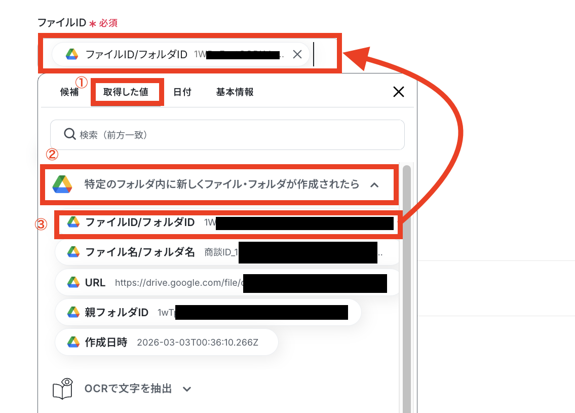 手入力や候補などから選んでしまうと、フローボットが起動する度に毎回同じファイルIDが反映されてしまうので注意が必要です!