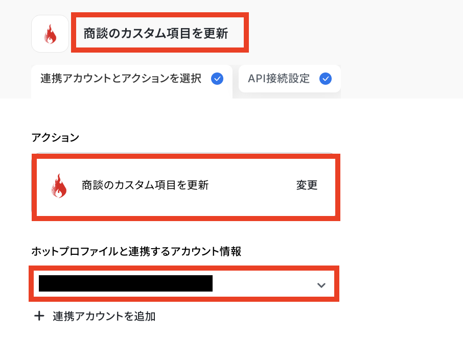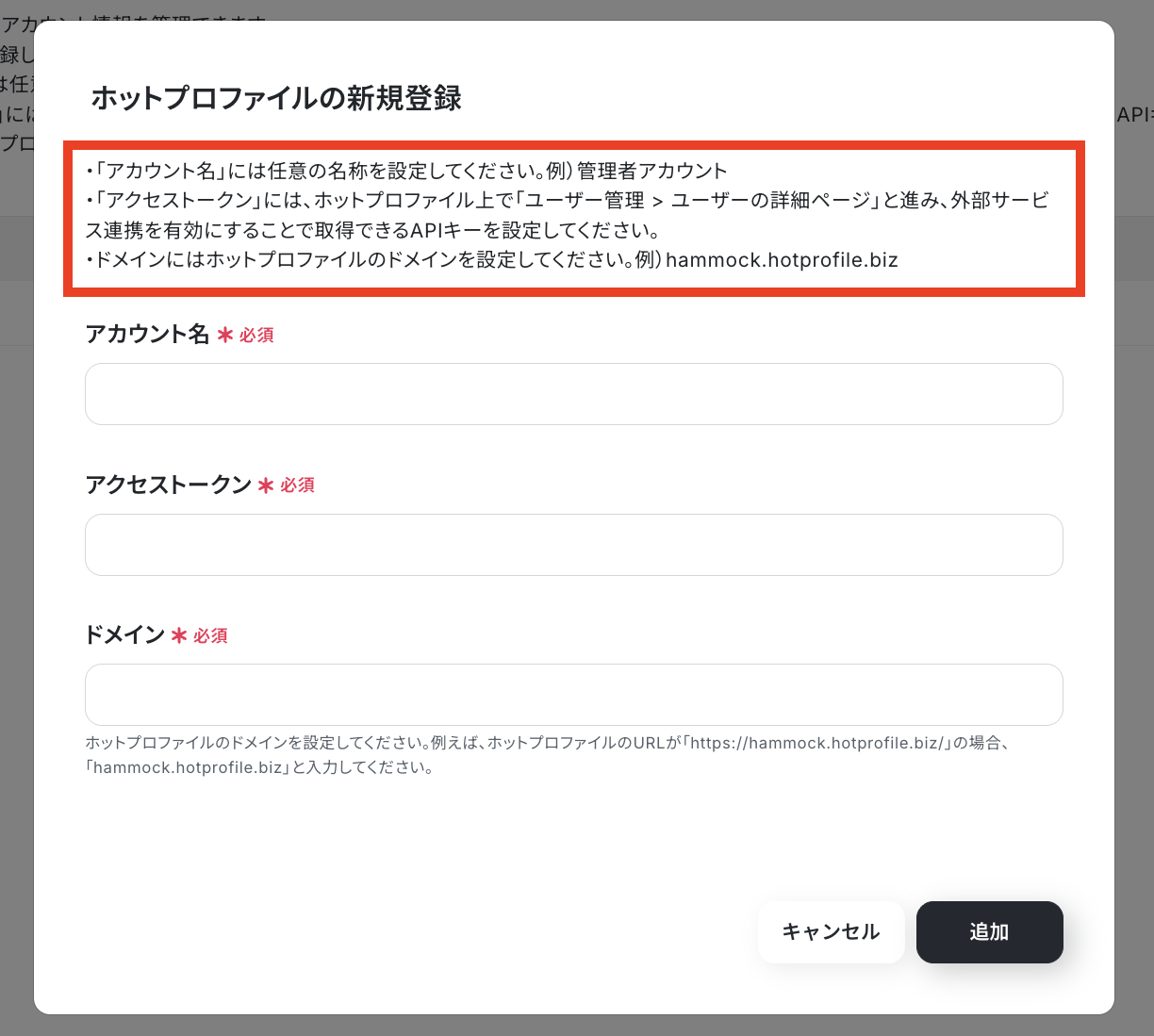 赤枠部分を確認しながらホットプロファイルにアクセスして「アカウント名」「アクセストークン」「ドメイン」を入力したら「追加ボタン」をクリックして連携完了です!