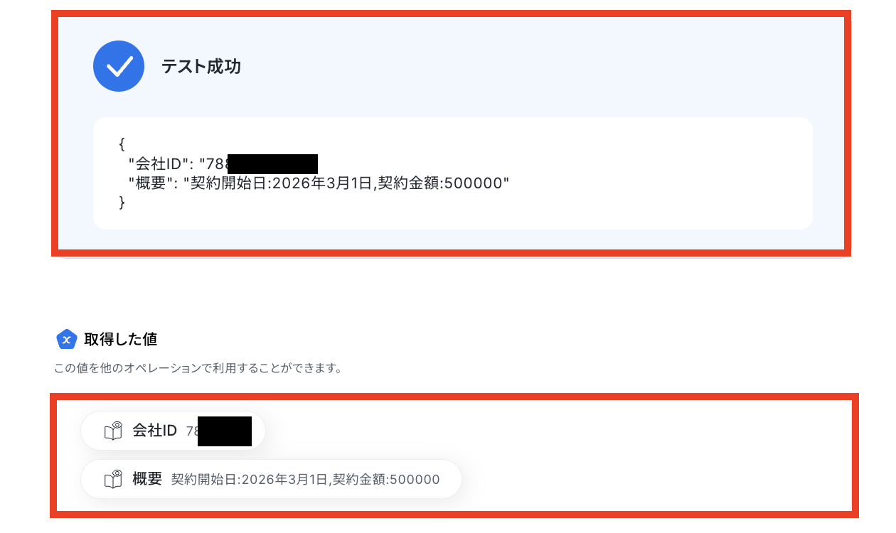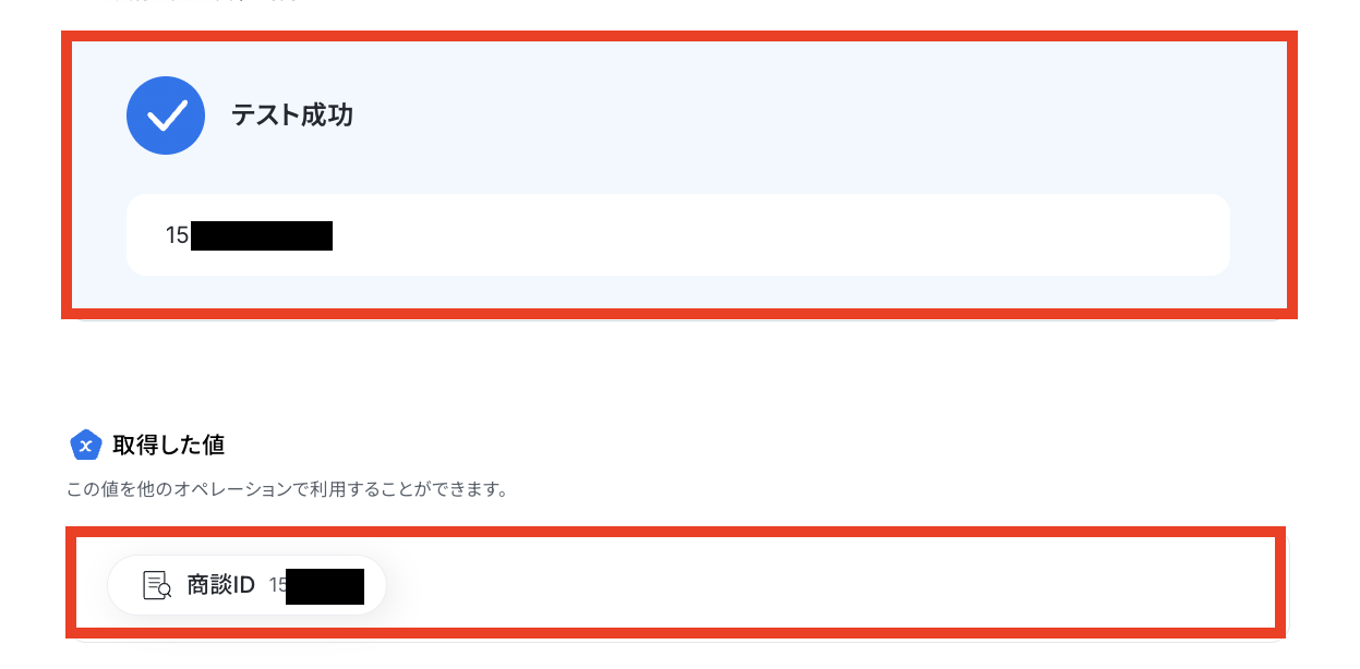 テストに成功すると、先ほど指定した条件に合致するHubSpotのデータが「取得した値(※)」の欄に反映されるので、確認できたら「完了」をクリックしてください。