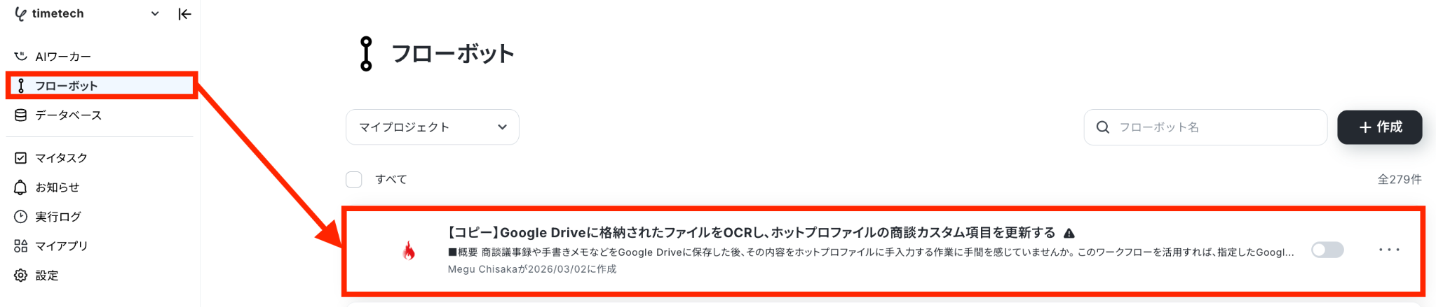 左側にあるメニューの「フローボット」から、コピーしたテンプレートを開きます。