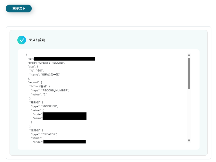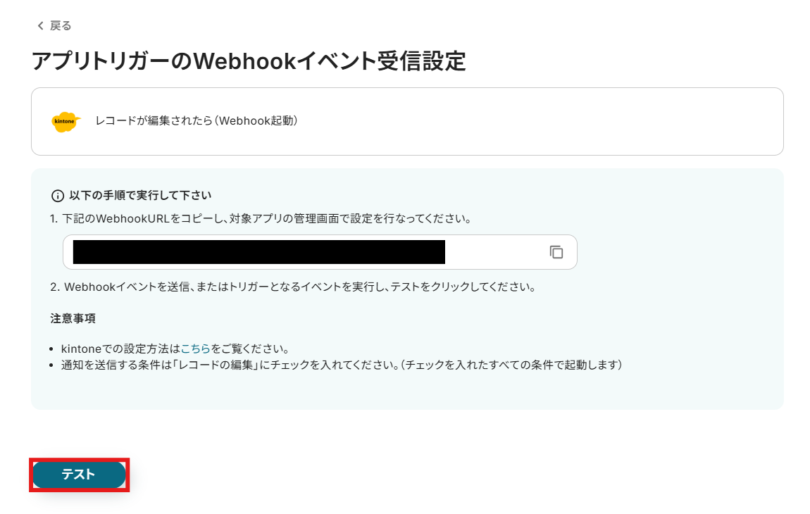 kintoneでのレコードの編集が完了したら、Yoom画面に戻ってテストボタンをクリックしましょう。