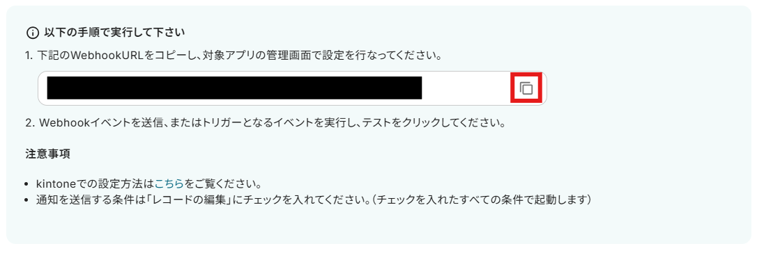 次の画面で表示されるWebhookURLをコピーし、こちらの手順でkintoneに設定を行ってください。