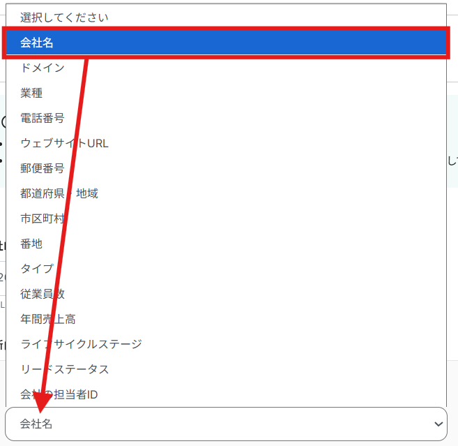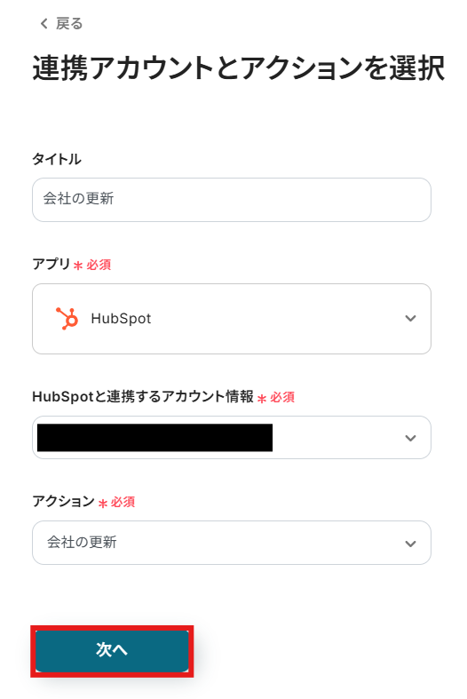 - アクション:プルダウンより設定可能です。今回はデフォルトで設定されている項目(会社の更新)のまま進みましょう。