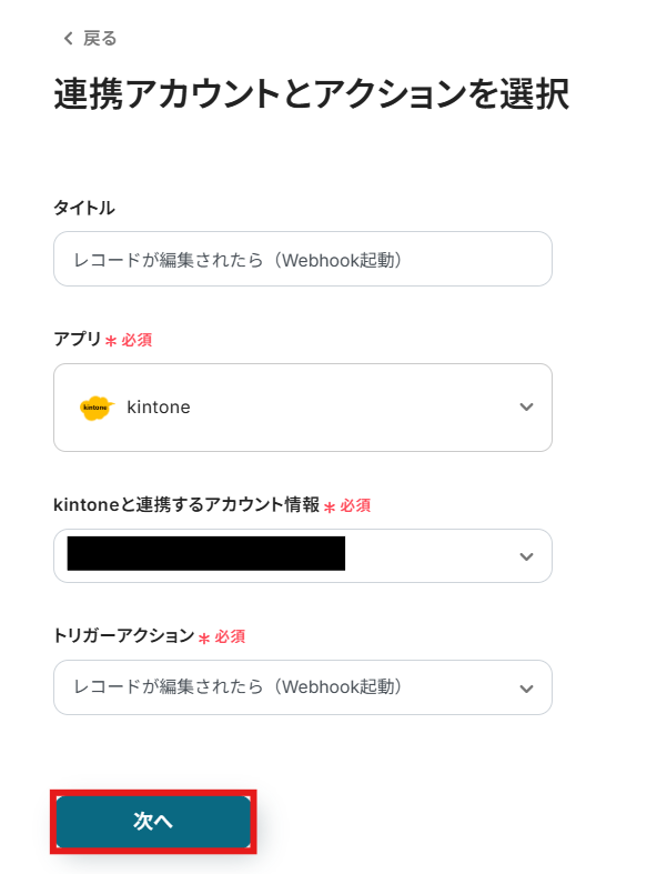 - トリガーアクション:プルダウンより設定可能です。今回はデフォルトで設定されている項目(レコードが編集されたら(Webhook起動))のまま進みましょう。