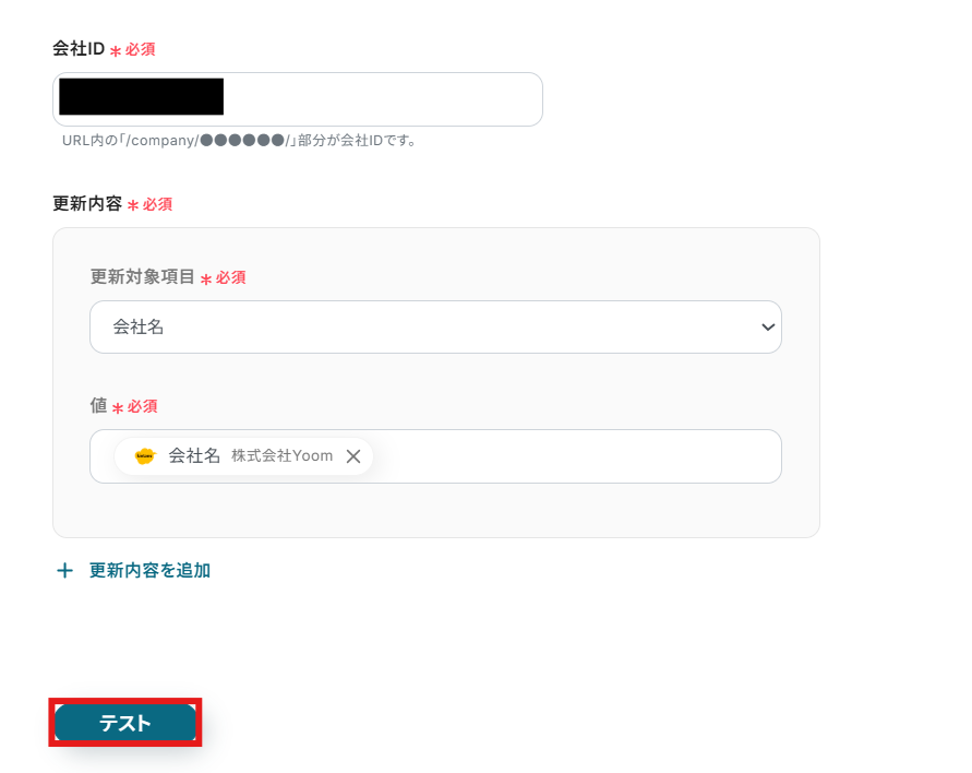 今回はテスト用に会社名のみを設定していますが、必要に応じて更新する対象を追加してください。