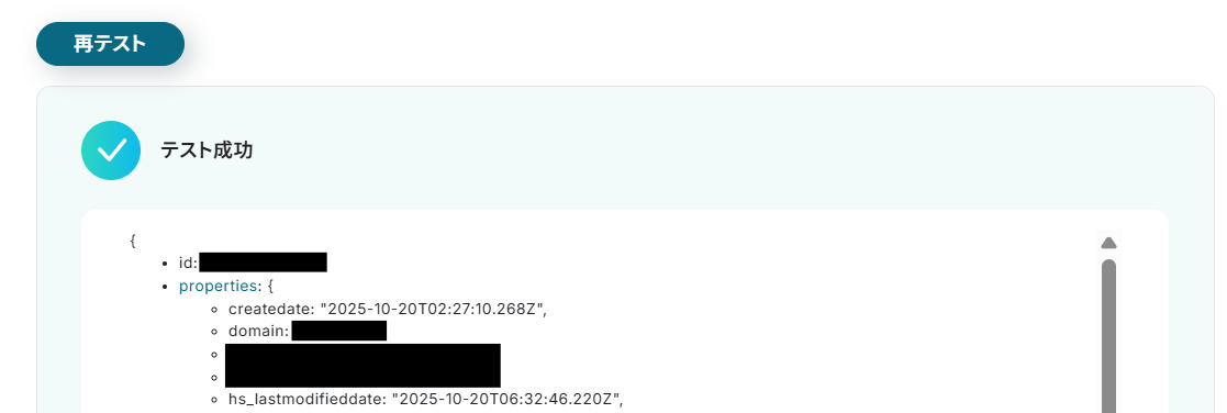 設定が完了したらテストボタンをクリックしましょう。(※実際にHubSpotの値が編集されます。)