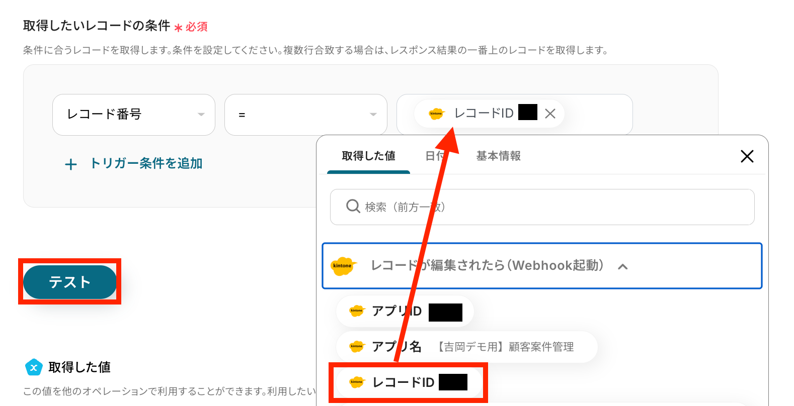 取得したいレコードの条件を、前回のステップで取得した値を利用して設定します。