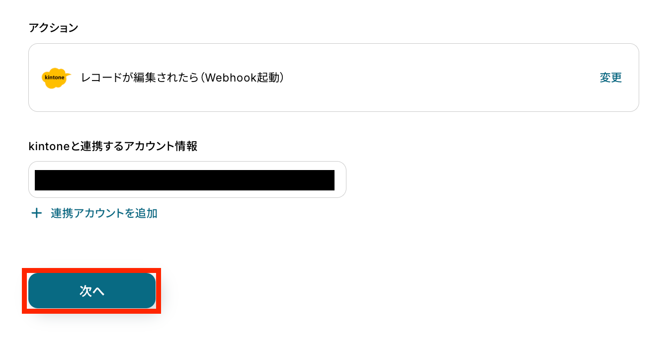アクションはテンプレートのままで、アカウントの情報の間違いがないかをチェックします。