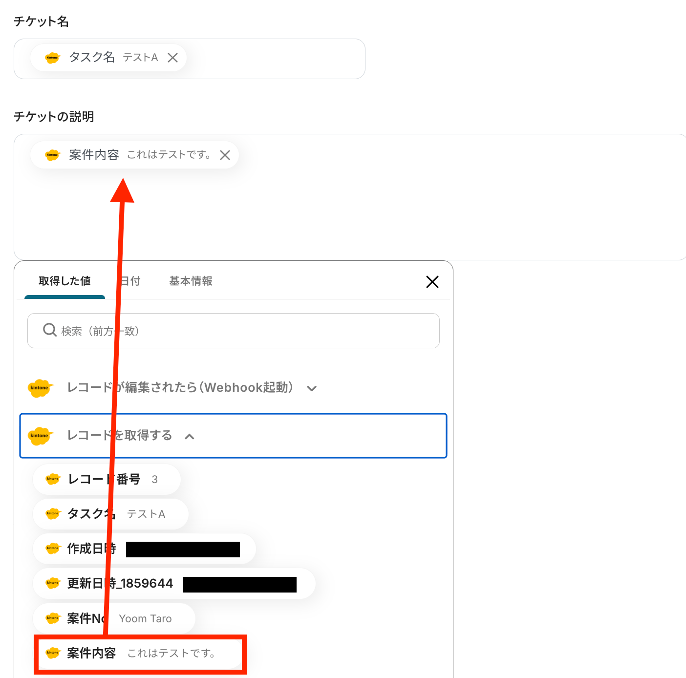 チケット名やチケットの説明を、取得した値を活用しながら設定します。取得した値を活用することで、固定値ではなく、トリガーが実行されるたびに最新の情報が反映できます。