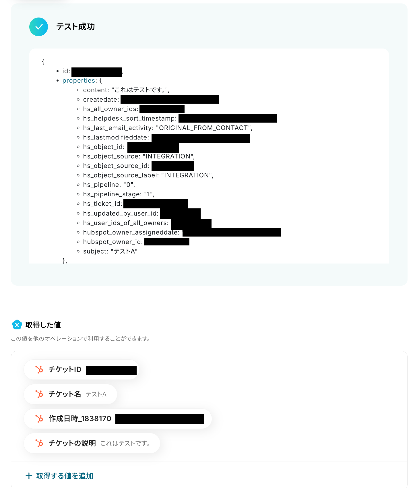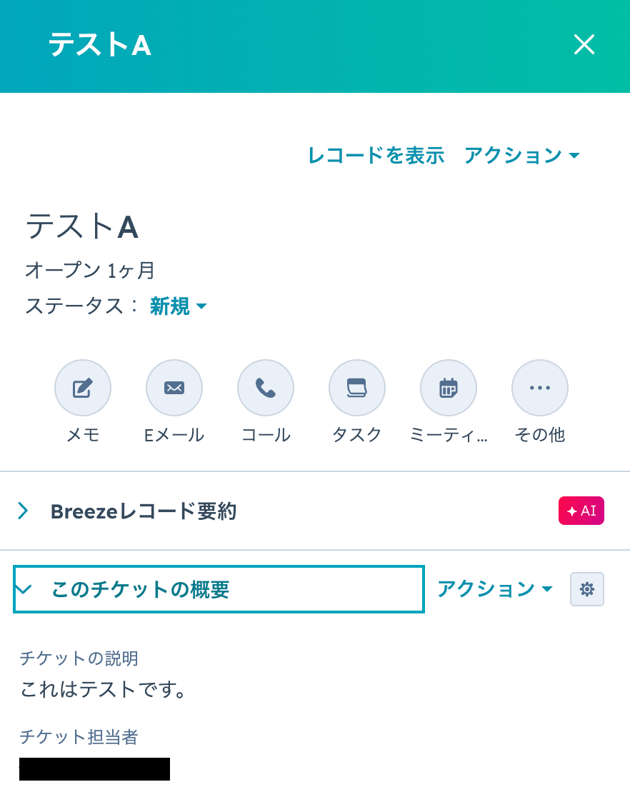 テスト成功という表示が出てきたら、HubSpotのチケットが更新されています!