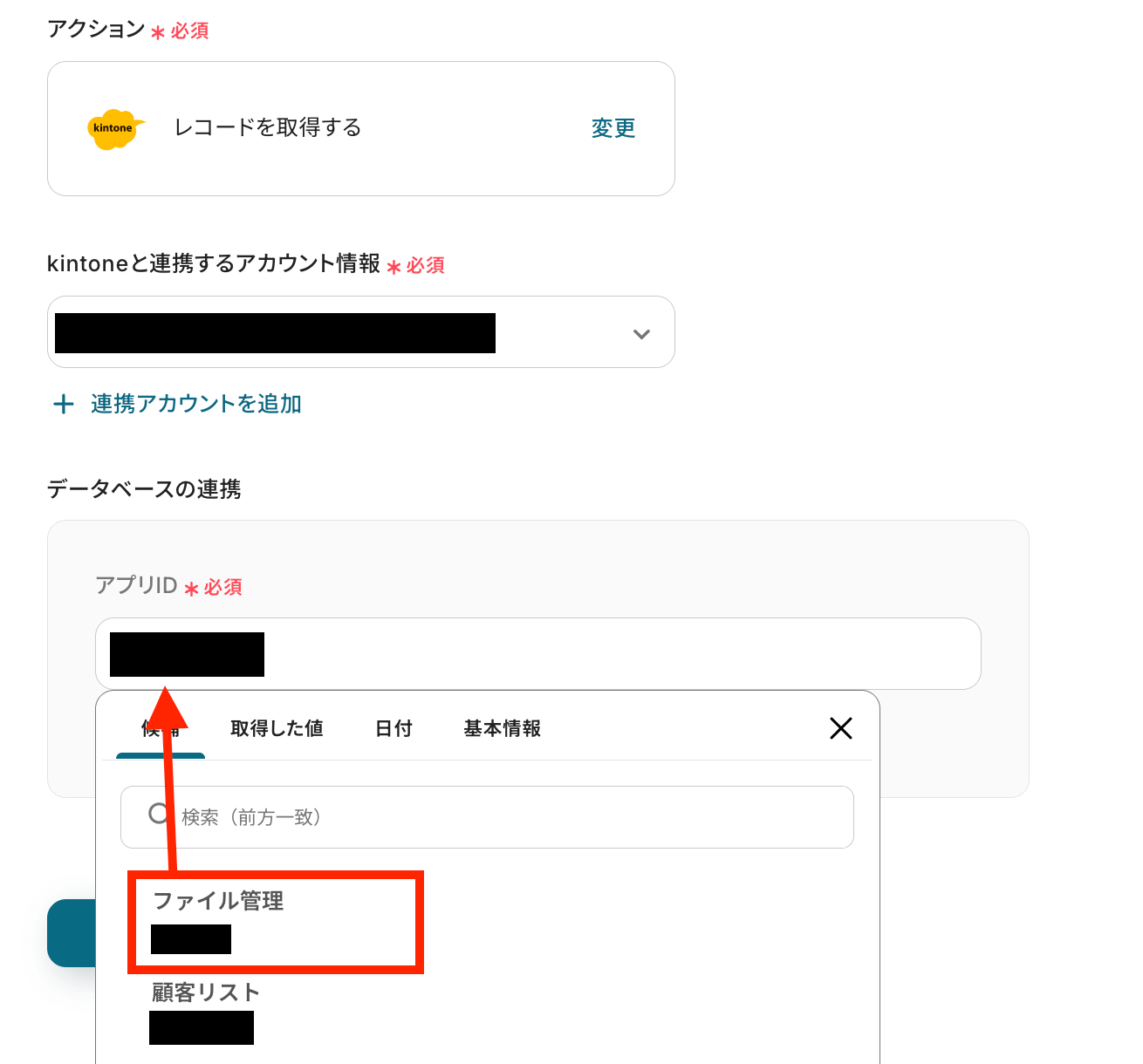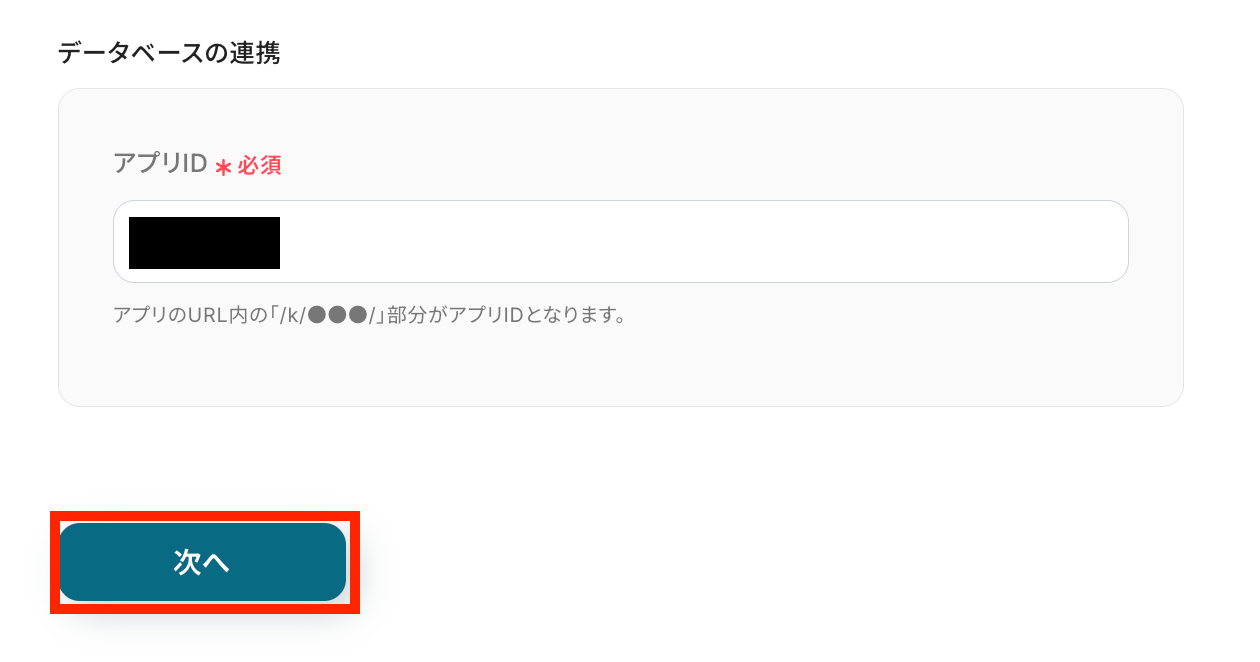 kintoneのデータベースの連携では、アプリIDを表示される候補の中から選択して設定しましょう。