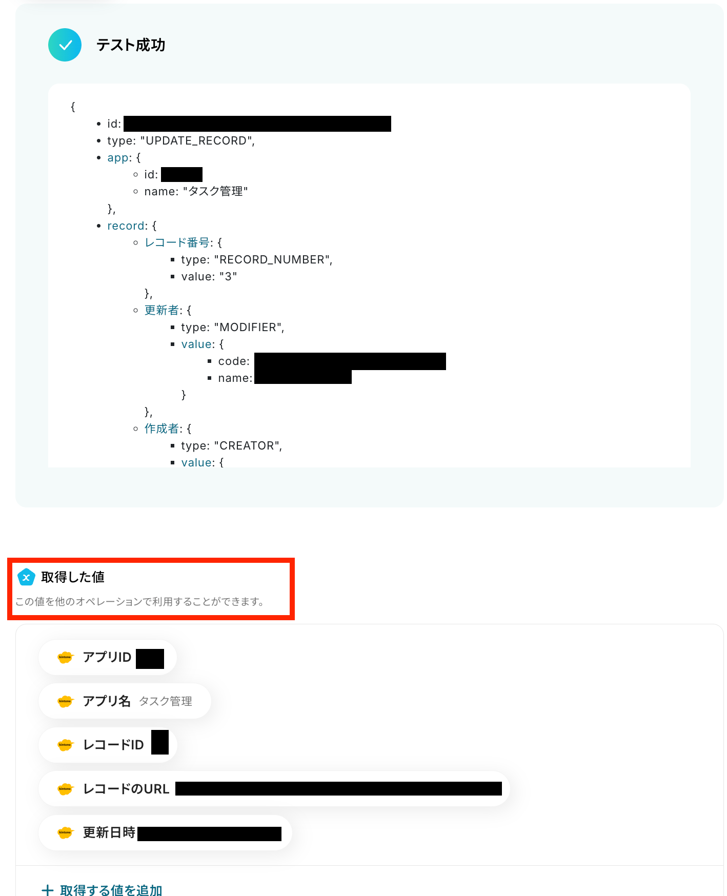 ※取得した値とは、トリガーやオペレーションにて受け取ったデータのことです。