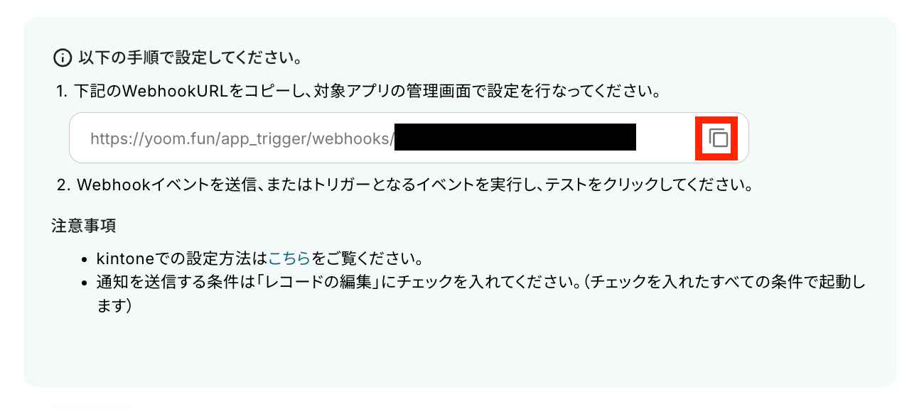 WebhookのURLをコピーして、kintoneの管理画面でWebhookの設定を行います。