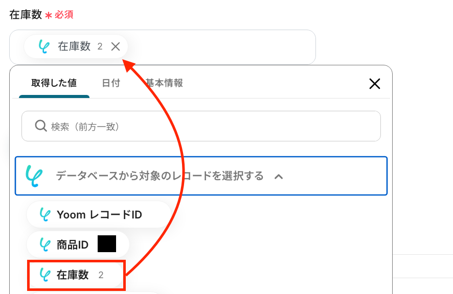 「在庫数」:入力欄をクリックして表示される取得した値から選択。