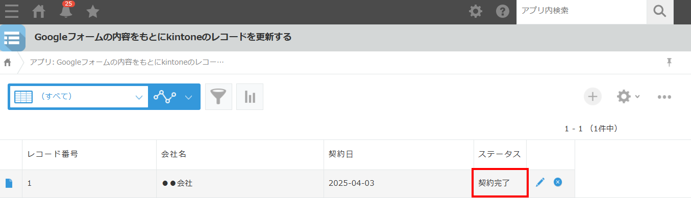 入力が完了したら、「テスト」を実行してください。 テストが成功したら、kintoneアプリにデータが更新されているか確認してみましょう。 今回は、下記画像のようにステータスが「契約完了」になっているのが確認できました! 無事にデータの反映が確認できたらYoom画面に戻り、「保存する」を押してください。