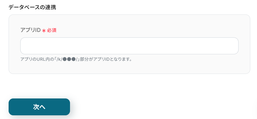 kintoneアプリの準備ができたら、Yoom画面に戻ります。 タイトルなどは先ほどステップ1で入力した内容が反映されているのでスクロールし、データベースの連携項目を入力します。 アプリIDの入力欄下にある注釈を参考に、先ほど作成したkintoneアプリのアプリIDを入力してください。 入力が完了したら「次へ」を押してください。