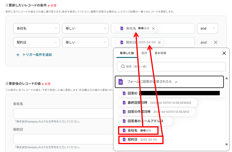 更新したいレコードの条件:更新したいkintoneのレコードについて条件を設定します。 今回は下記画像のように、会社名と契約日をGoogleフォームから選択しました。条件の追加や条件内容の変更も可能ですので、お好みでカスタマイズしてください。