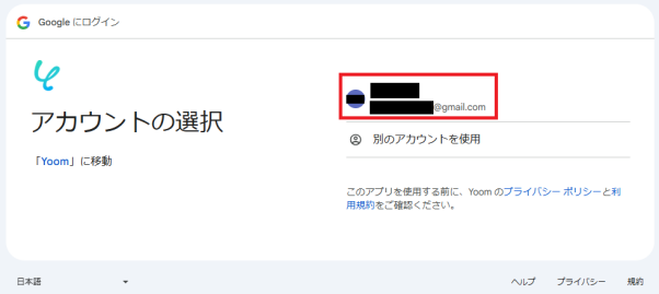 3.アカウントの選択 連携したいアカウントを選択します。 ※表示されたアカウント以外を連携したい場合は「別のアカウントを使用」をクリックし、連携したいアカウントで選択してください。 アカウント選択後、画面が遷移しますので「次へ」をクリックします。