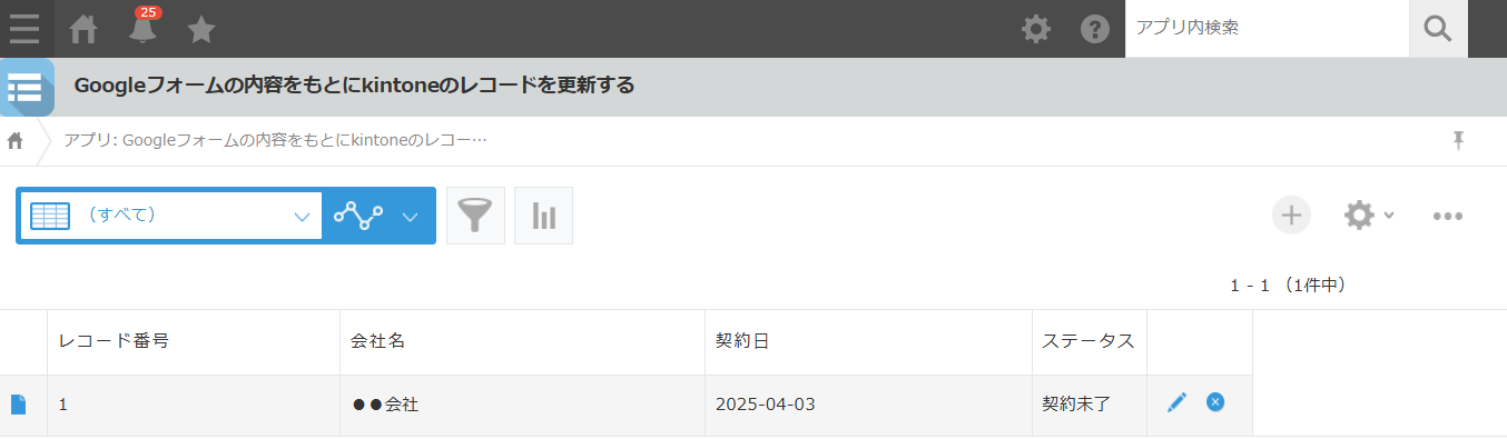 2.データベースの連携 ここでは、Googleフォームの回答を反映するkintoneアプリを設定します。 kintoneアプリの準備がまだ出来ていない場合は、この後のテスト操作のためこのタイミングで作成してください。 また、更新対象となるレコードも合わせて作成してください。 今回は下記画像のようなkintoneアプリを作成し、レコードも追加しました!