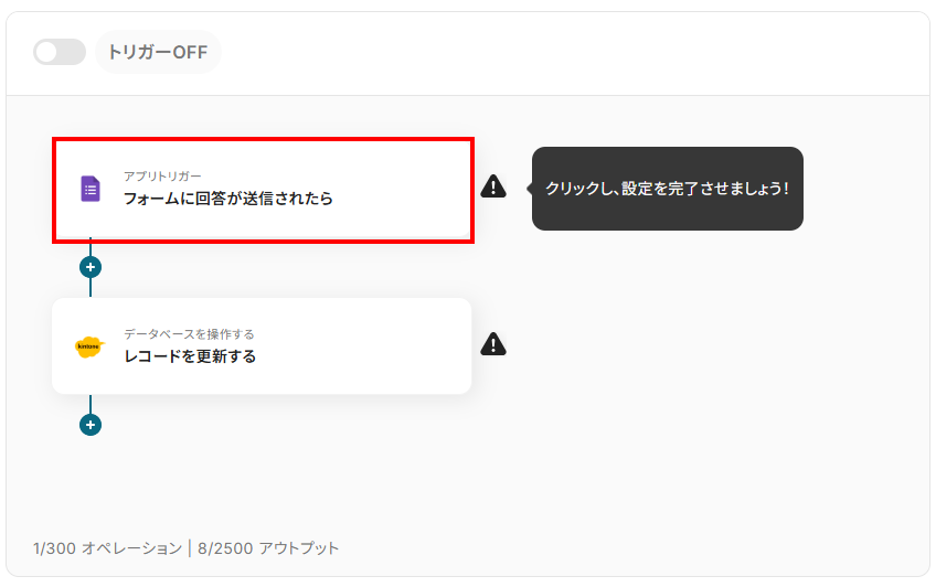 1.トリガーの選択 記念すべき最初の設定です! まずは以下の赤枠をクリックしてください。 画面が遷移し、先ほどステップ1で入力した内容が反映されています。タイトルなどの修正が不要であれば、そのまま「次へ」をクリックします。