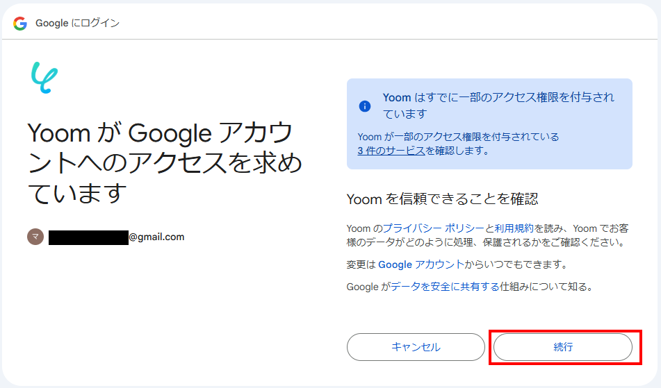 4.アクセス許可 YoomがGoogleアカウントにアクセスするため、下記画像のように許可を求める画面となります。赤枠の「続行」を押してください。