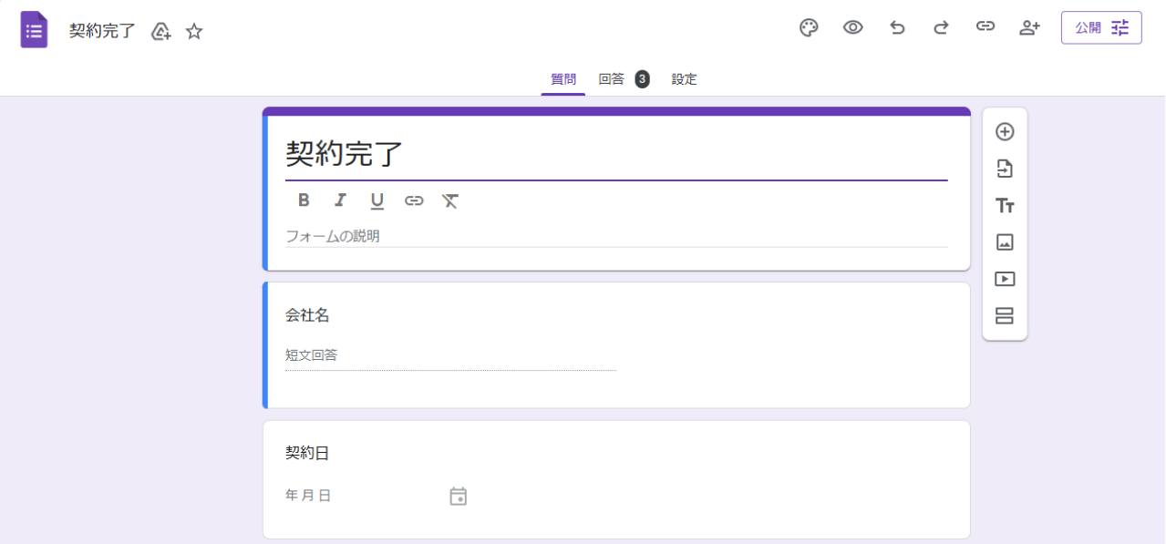 2.アプリトリガーのAPI接続設定 ここでは、トリガーとなるGoogleフォームの設定を行います。 Googleフォームの準備がまだ出来ていない場合は、この後のテスト操作のためこのタイミングで作成してください。 今回は下記画像のようなGoogleフォームを作成しました!