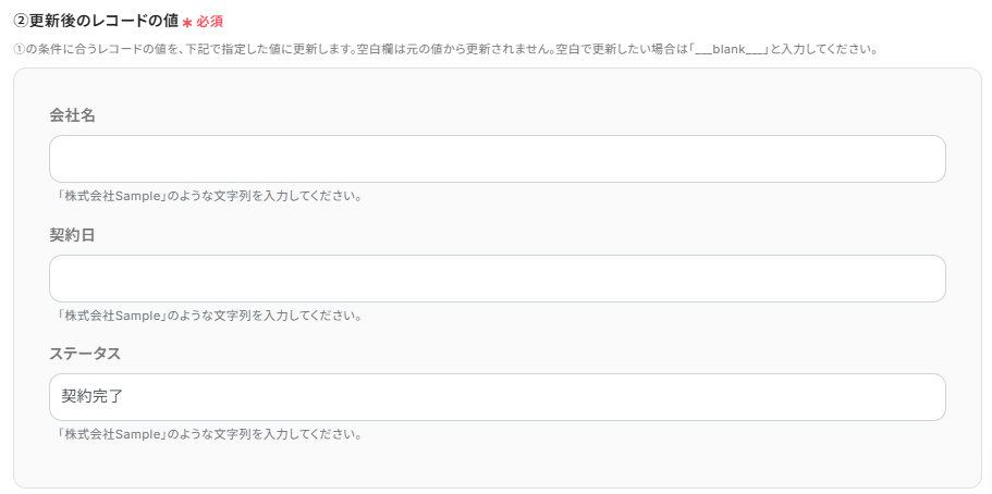 更新後のレコードの値:レコードの更新内容について設定します。 今回は、下記画像のようにステータスを「契約完了」に更新する内容にしました。入力欄をクリックするとアウトプットが表示されますので、どの項目になにを更新したいのかお好みでカスタマイズしてください。 ※アウトプットについて詳しくはこちら