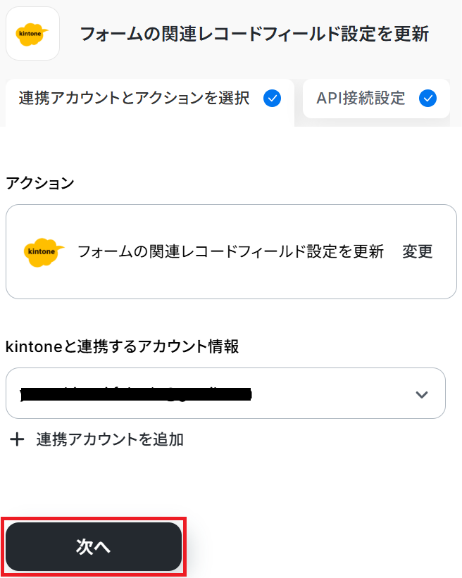 ステップ3と同様、アクションは「フォームの関連レコードフィールド設定を更新」のまま「次へ」をクリックします。