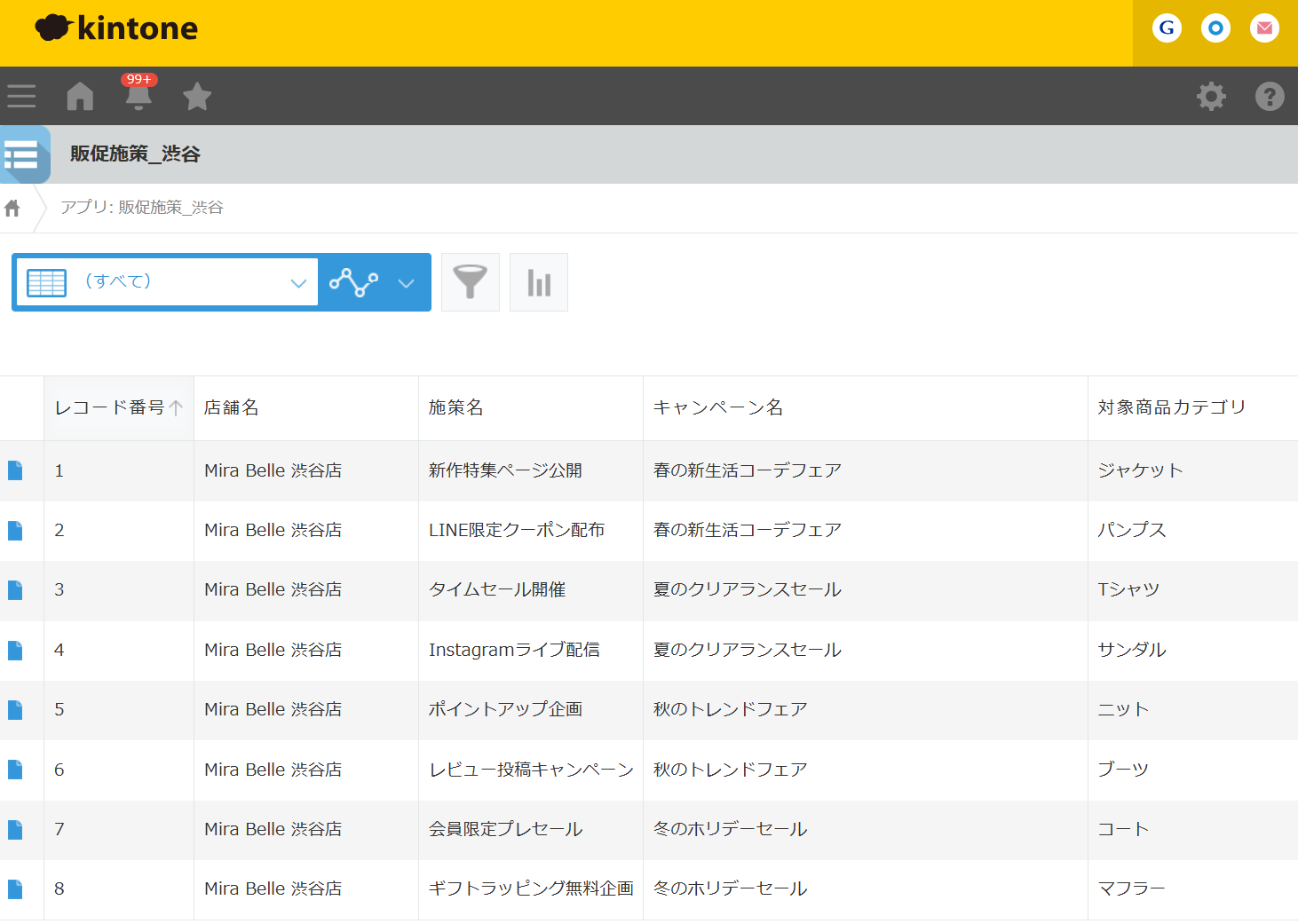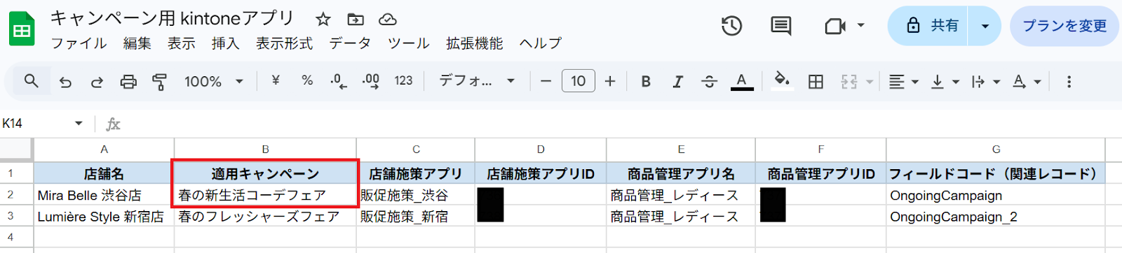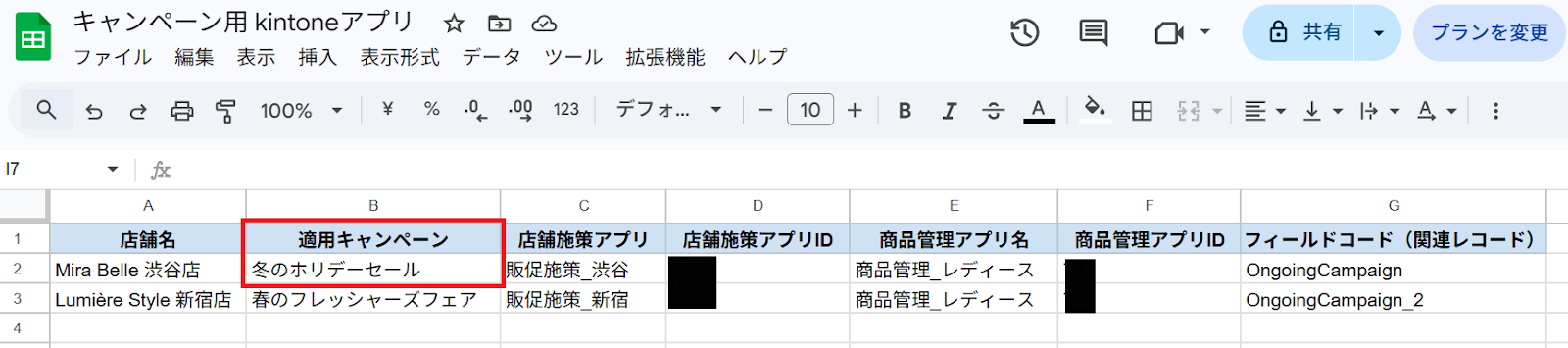 アプリ管理用のシートをご用意ください。 この際、他の列とデータが重複しない一意の値 が入った列を作成しましょう。(今回でいうとA列「店舗名」) 今回は渋谷店のB列「適用キャンペーン」を更新し、kintoneのレコード絞り込み条件を更新する想定で進めていきます。