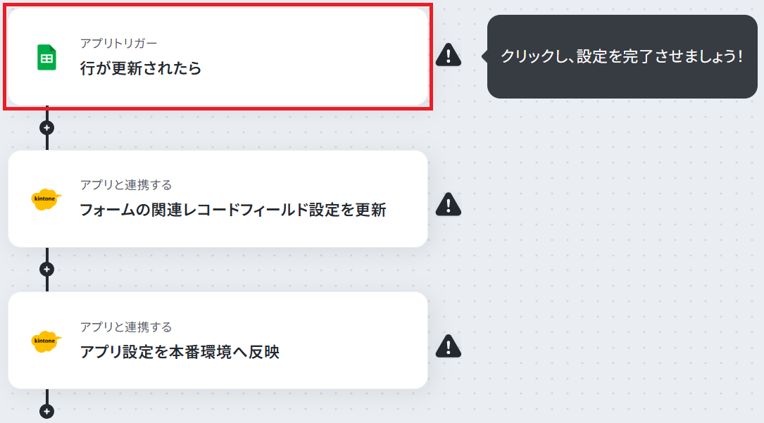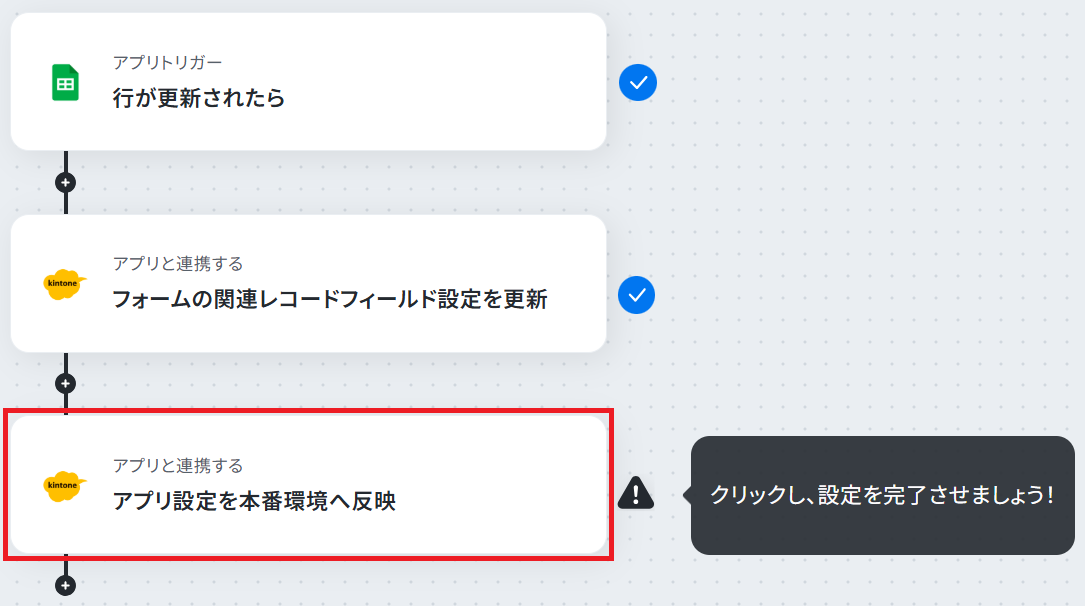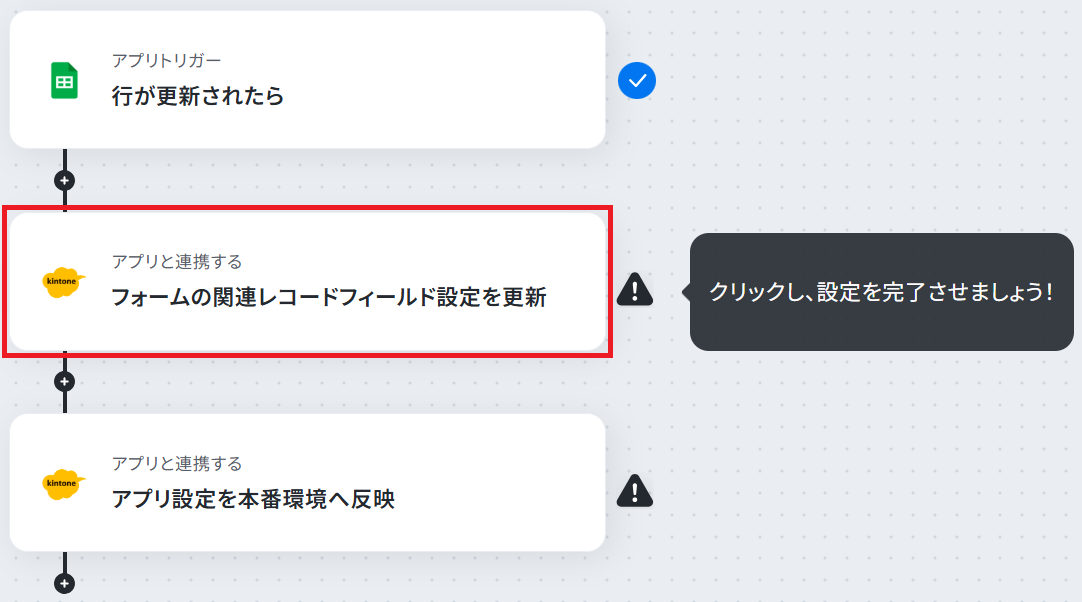 はじめに、Google スプレッドシートとkintoneをYoomと連携します。 次に、トリガーでGoogle スプレッドシートを選択し、「行が更新されたら」というアクションを設定します。 続いて、オペレーションでkintoneの「フォームの関連レコードフィールド設定を更新」アクションを設定します。 最後に、オペレーションでkintoneの「アプリ設定を本番環境へ反映」アクションを設定し、変更内容を適用します。 ※「トリガー」:フロー起動のきっかけとなるアクション、「オペレーション」:トリガー起動後、フロー内で処理を行うアクション■このワークフローのカスタムポイント