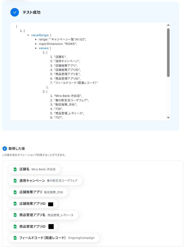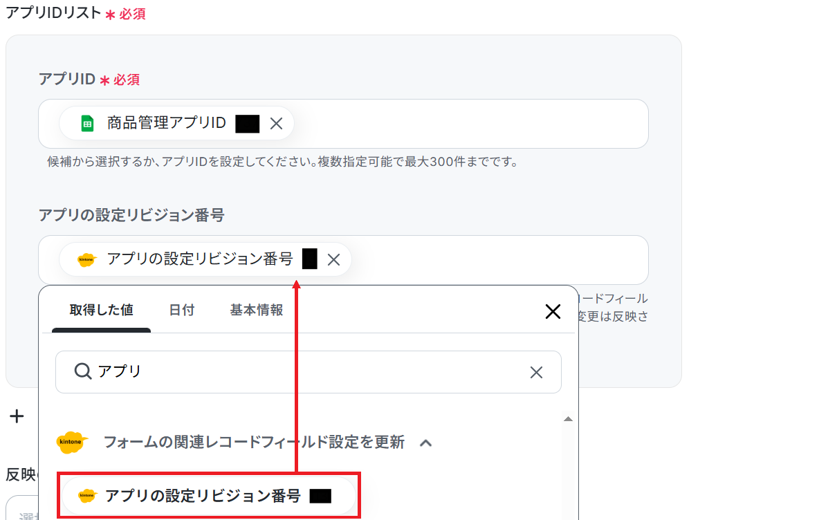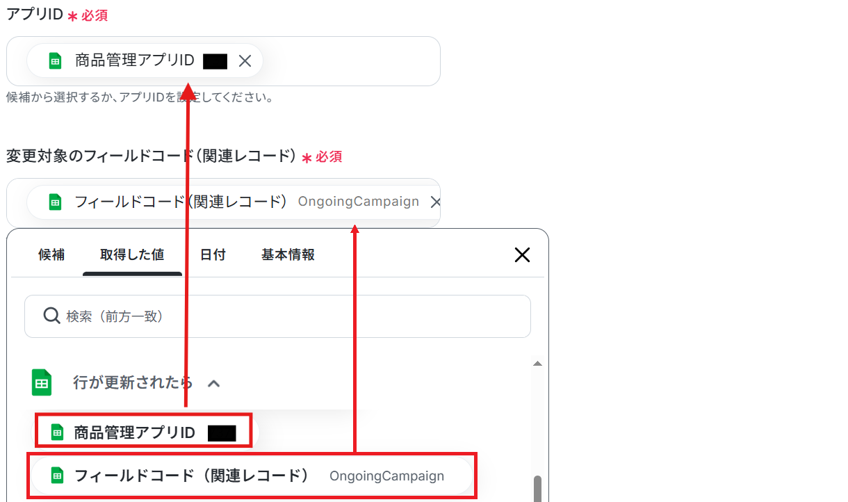 アプリID ・変更対象のフィールドコード(関連レコード) の欄には、Google スプレッドシートから取得した値が予め設定されているのでそのままで大丈夫です。