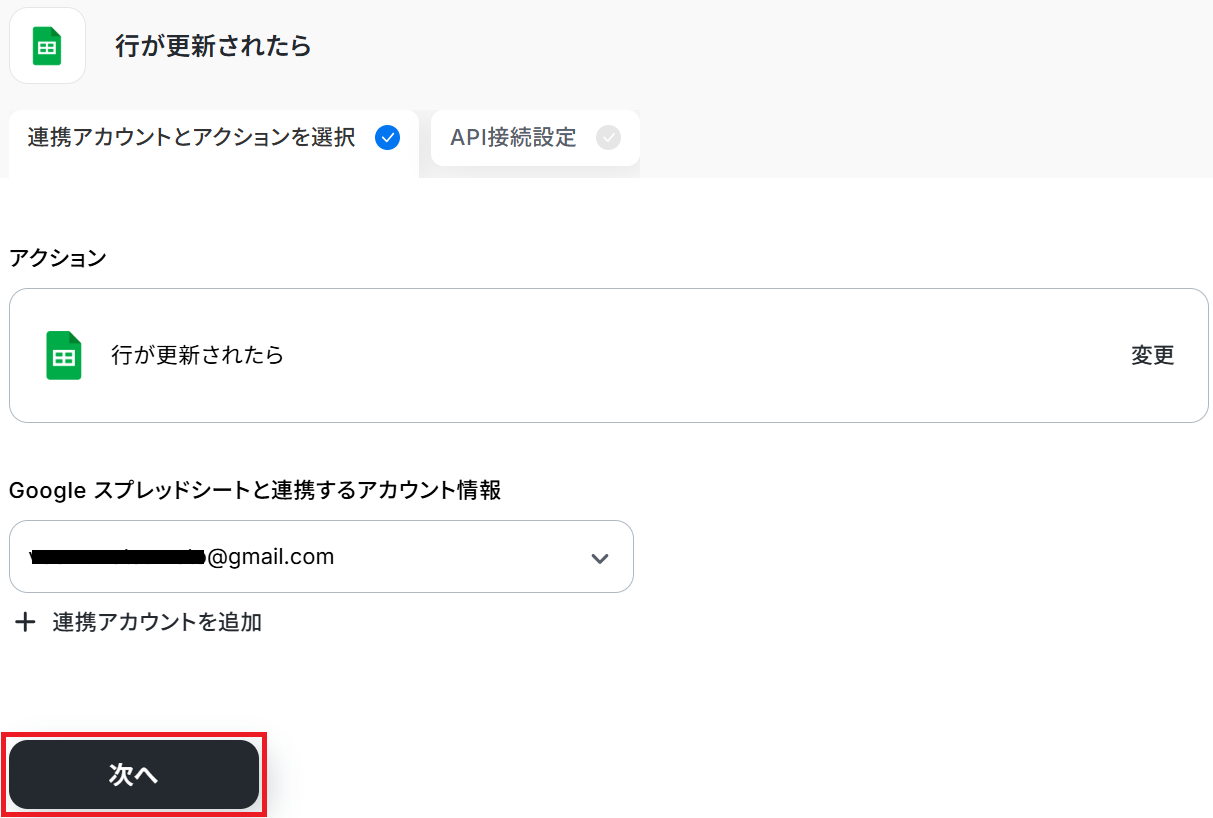 タイトル と連携するアカウント情報 を任意で設定し、アクションはテンプレート通りに「行が更新されたら」のまま「次へ」をクリックします。