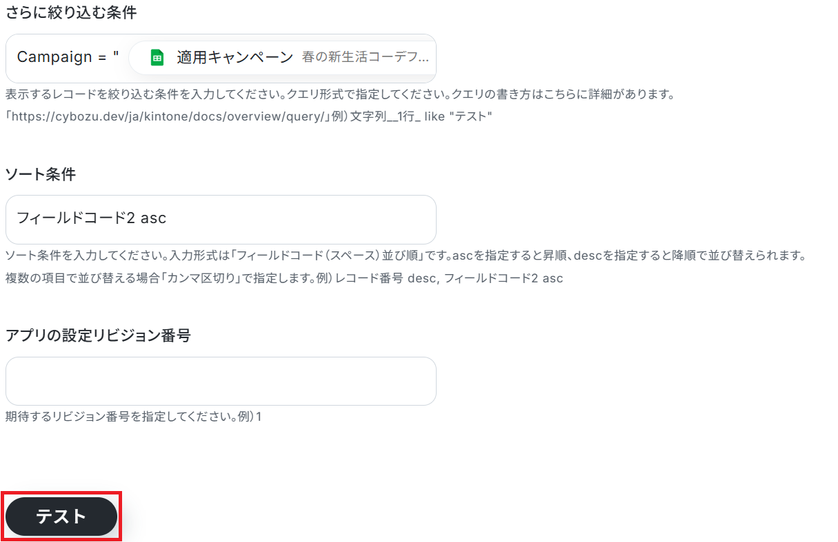 さらに絞り込む条件 の欄には「適用キャンペーン」の値を用いたクエリが既に設定されているので、あとはソート条件 を任意で設定してテストしましょう。 今回はアプリの設定リビジョン番号 を取得する設定のため、この欄はもちろん空欄でOKです。