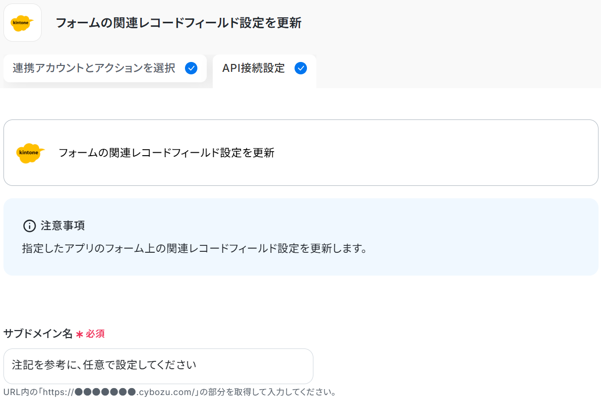 ステップ4:kintoneのレコード絞り込み条件を更新する設定 先ほど取得したGoogle スプレッドシートの情報をもとに、kintoneのレコード絞り込み条件を更新します。「フォームの関連レコードフィールド設定を更新」をクリックしましょう。