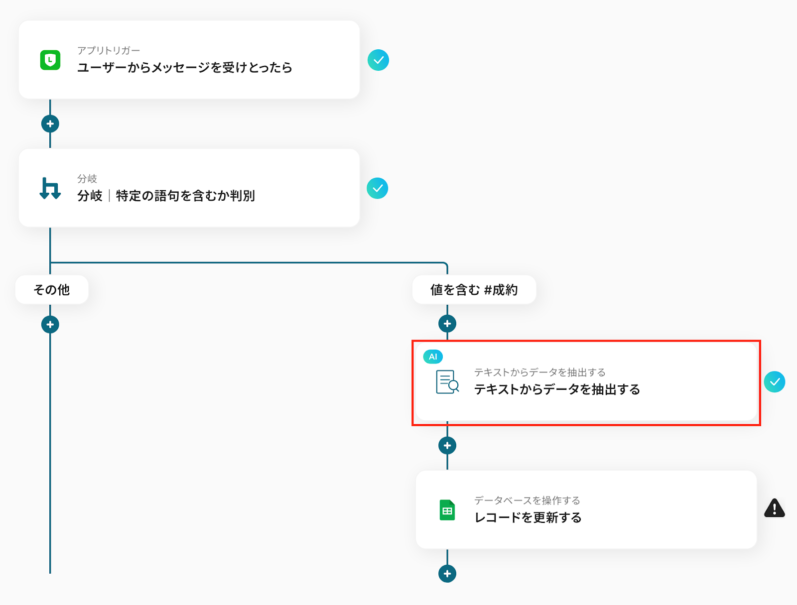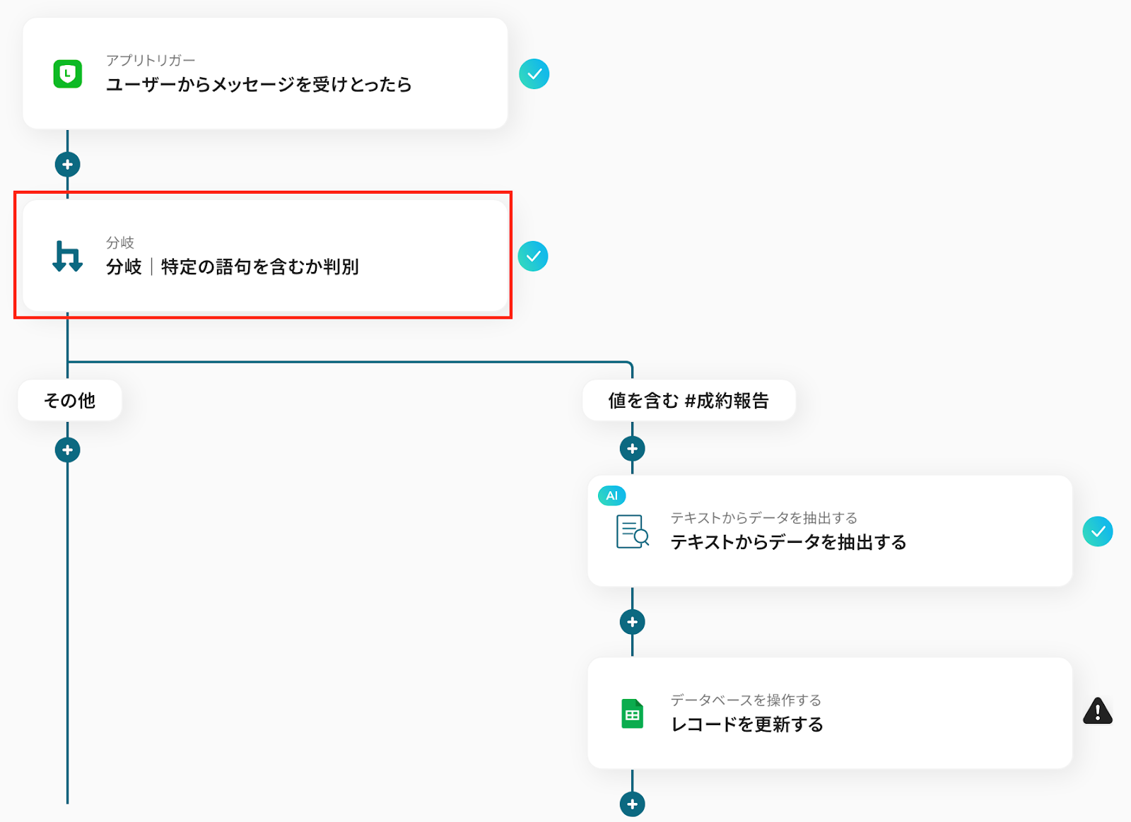 今回は、【成約】というキーワードを含むメッセージを検知する設定を行います。
