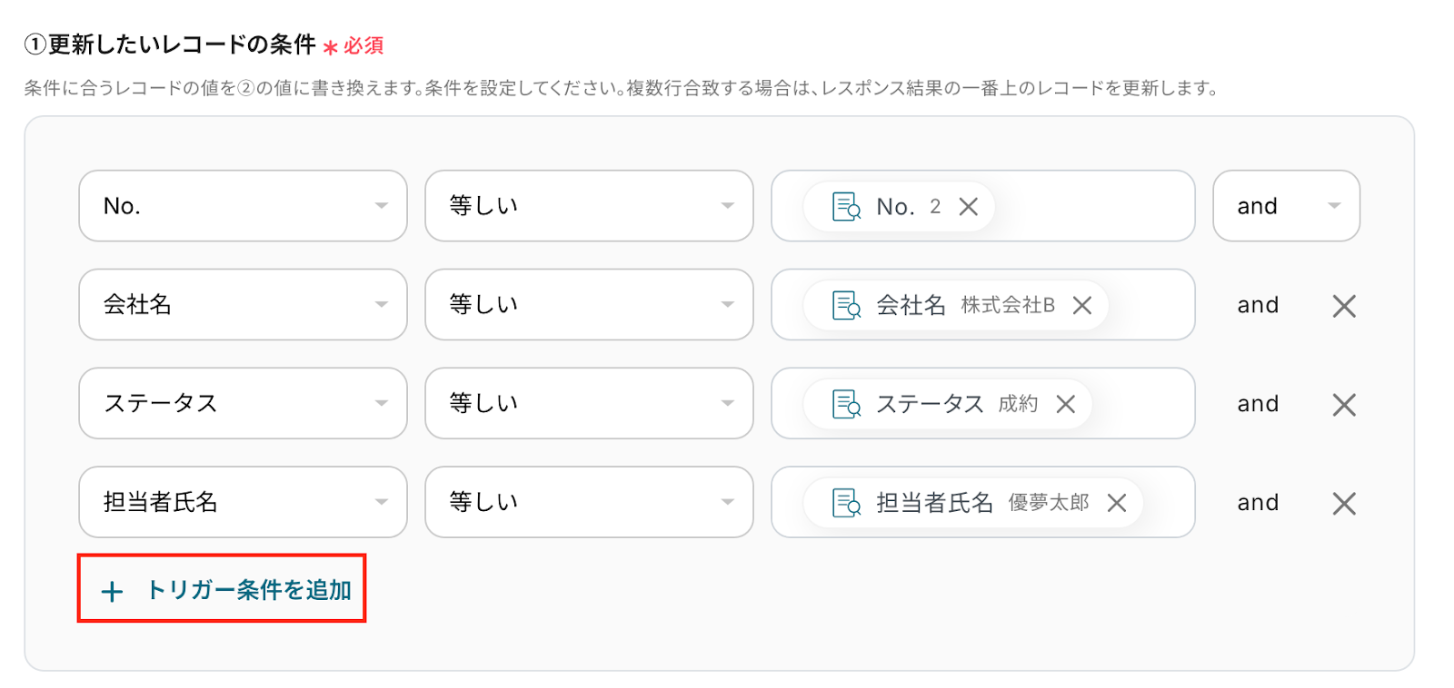 ※更新したいレコードの条件は赤枠の「+トリガー条件を追加」から追加できます。