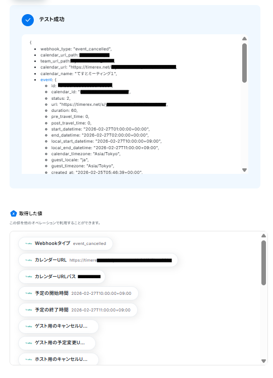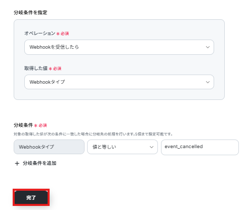 ここで「Webhookタイプ」の値が「event_cancelled」と等しいという分岐の条件にすることで、予定がキャンセルした場合のみ分岐されるようになります。