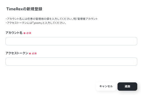 TimeRexを選択したら、アカウント名とアクセストークンを入力して「追加」をクリックしてください。