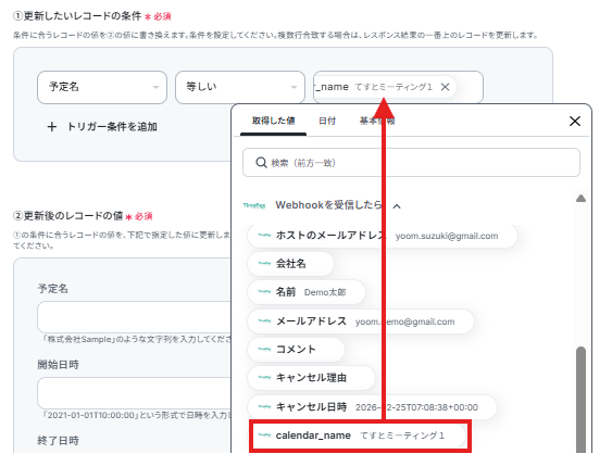 - 続いて、オペレーションでGoogleカレンダーの「予定を検索する」アクションを設定し、TimeRexから連携された情報(例えば、予約者の情報や予定の日時など)を基に、削除対象となる予定を特定します。