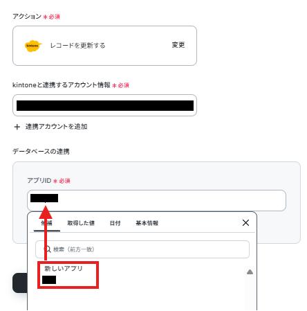 - kintoneのレコードを更新するアクションでは、どのレコードを更新するかの条件や、更新するフィールドの値を任意で設定してください。