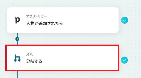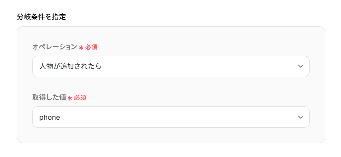 - 分岐機能では、追加された人物情報をもとに「特定の項目が空欄の場合」など、後続のアクションを実行する条件を自由にカスタマイズ可能です